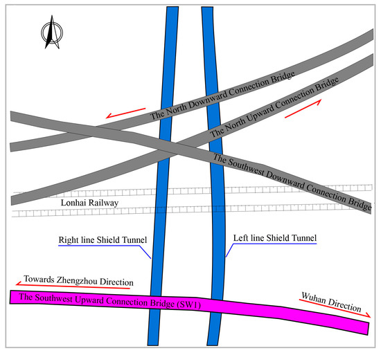This metro project utilizes shield tunneling from right CK18+920 to right CK19+030, passing beneath several high-speed railway link bridges. These bridges, listed from smallest to largest mileage, include the North Up Connection Bridge (NU), North Down Connection Bridge (ND), Southwest Down Connection Bridge (SW2), and Southwest Up Connection Bridge (SW1). Figure 1 illustrates their spatial relationship with the shield tunnel. All four bridges are passenger dedicated and designed for a speed of 160 km/h. The NU, ND, and SW1 bridges are simply supported beams. The SW2 bridge section being crossed is a four-span continuous beam.