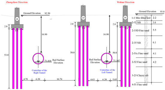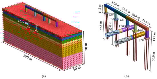 In this study, the MIDAS/GTS NX finite element software was used to conduct three-dimensional (3D) numerical simulation and analysis of the shield tunnel crossing under the SW1 Bridge of the Shijiazhuang–Wuhan Passenger Railway Connection Bridge. Based on the spatial relationship between the shield tunnel of ZJ Section of Metro Line 5 with the SW1 Bridge, a 3D finite element calculation model was established, as shown in Figure 4. In order to analyze the impact of shield excavation on the bridge, the model considered three closely adjacent piers as well as two relatively distant piers and pile foundations, numbered from smallest to largest as 13#, 14#, 15#, 16#, and 17# (Figure 4b). The pile lengths of piers 15–17# are 50 m, while those of piers 13# and 14# are 52.5 m and 53.0 m, respectively. The heights of piers 14–17# are 13.2 m, whereas pier 13# has a height of 11.2 m. The model has an X-direction range of 200 m, a Z-direction range of 70 m, and a Y-direction range (shield excavation direction) of 50 m. Especially, the soil layer thickness along the Z-direction is shown in Table 1. Consequently, the total dimensions are 200 m × 50 m × 70 m.