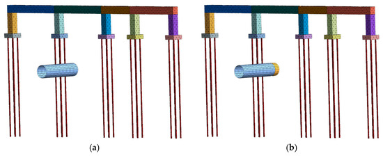 The surrounding rock is simulated using solid elements and follows the Mohr–Coulomb yield criterion. The bridge piers and caps are also simulated using solid elements with an elastic model. The shield tunnel segments are modeled using two-dimensional structural elements, while the bridge piles and isolation piles are modeled using one-dimensional structural elements. In this 3D computational model, the study area, including the shield excavation and surrounding soil, is divided into 445,076 solid elements and 1,780,304 nodes (as shown in Figure 4a). The caps, bridge piers, and pile foundations are divided into 24,216 structural elements and 96,864 nodes, with the specific division shown in Figure 4b.