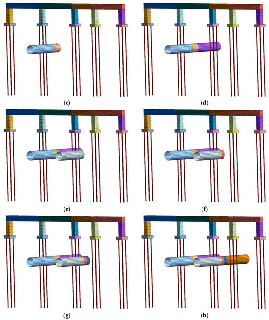 Schematic diagram of the eight typical construction steps for twin-bore shield tunnel excavation: (a) S1; (b) S2; (c) S3; (d) S4; (e) S5; (f) S6; (g) S7; (h) S8.