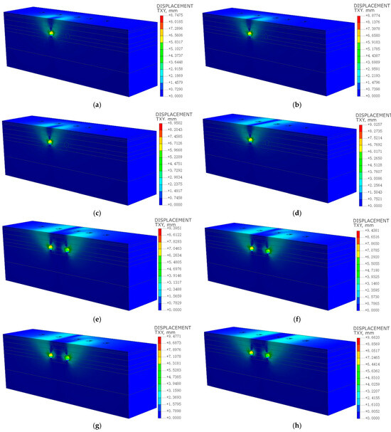 Horizontal displacement contour map of ground during full excavation of shield tunnel: (a) S1; (b) S2; (c) S3; (d) S4; (e) S5; (f) S6; (g) S7; (h) S8.