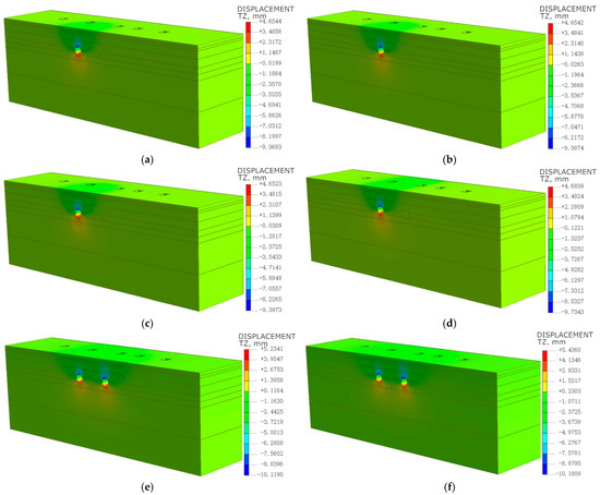 Figure 6 shows the horizontal displacement cloud map of the soil during the entire excavation process of the shield tunnel. During the excavation of the single-line tunnel from S1 to S4, horizontal displacement mainly occurs on both sides of the tunnel, with the direction of soil displacement pointing towards the tunnel center. The maximum horizontal displacements are 8.74 mm, 8.87 mm, 8.95 mm, and 9.02 mm, respectively. As the excavation progresses, the horizontal displacement gradually increases. This is due to the shield machine’s gradual advancement and the continuous expansion of the excavation area, which increases the disturbance to the surrounding soil, leading to greater soil displacement. Additionally, the maximum horizontal displacement growth rates are 1.49%, 0.90%, and 0.78%, respectively. The growth rates indicate that the increase in maximum horizontal displacement is not uniform during the shield tunnel excavation. From S1 to S4, the growth rate is relatively low and shows a decreasing trend. This is because the initial advancement of the shield machine causes disturbance to the surrounding soil, and as the excavation progresses, the soil stress redistribution gradually stabilizes.