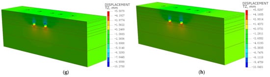 Vertical displacement contour map of ground during full excavation of shield tunnel (a) S1; (b) S2; (c) S3; (d) S4; (e) S5; (f) S6; (g) S7; (h) S8.