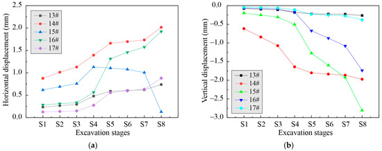 The maximum vertical displacement of the pile cap during shield tunnel excavation is shown in Figure 8b, as can be seen that it varies with different excavation stages. For all piers, in the initial stages of left tunnel excavation (S1 to S4), the vertical displacement of the pile cap increases as excavation progresses. This is due to the vertical displacement of the soil around the piles caused by tunnel excavation, which leads to vertical displacement of the pile cap. When the right tunnel excavation begins (S5), the vertical displacement of the pile caps of different piers continues to increase with the excavation stages. Particularly, for Piers 15# and 16#, located between the two tunnels, the vertical displacement of the pile caps becomes more pronounced after S5. This is because the stress changes in the soil due to twin tunnel excavation create a cumulative effect between the two tunnels, significantly increasing the vertical displacement of the pile caps. Additionally, the distance of the piers from the tunnel also affects the vertical displacement of the pile caps. Piers closer to the tunnel (e.g., Pier 14#) experience greater impact and, hence, greater vertical displacement of the pile caps, while piers farther from the tunnel (e.g., Piers 13# and 17#) experience less impact and smaller changes in vertical displacement of the pile caps.