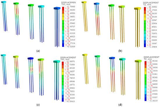 Cloud diagrams for pile foundations in Model A after the tunnel excavation: (a) horizontal displacement at S4; (b) settlement displacements at S4; (c) horizontal displacement at S8; (d) settlement displacements at S8.