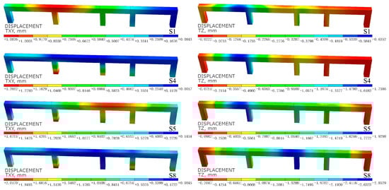 The horizontal and vertical displacement deformation cloud diagrams for the bridge deck and piers of the SW1 during shield tunnel excavation are shown in Figure 10. As the tunnel excavation progresses, the horizontal displacement of the bridge deck and piers gradually increases and the affected areas expand. During the excavation of the left line tunnel, Pier 14#, being closer to the left line tunnel, is the first to be impacted. From Stage 1 to Stage 4, the horizontal displacement of Pier 14#’s deck gradually increases, reaching a maximum of 1.038 mm. After the complete excavation of the left line tunnel (Stage 4), the deck displacement gradually decreases, while the piers below the deck exhibit more significant horizontal displacement, with a maximum of 1.39 mm. Pier 15#, located between the two tunnels, is less affected during the left line tunnel excavation. However, during the right line tunnel excavation, Pier 15#, being closer to the right line tunnel, begins to experience significant impact. At Stage 5, both the deck and piers of Pier 15# exhibit noticeable horizontal displacement, with a maximum of 1.67 mm. After the complete excavation of both tunnels (Stage 8), the range of impact broadens, and Pier 16# exhibits a maximum horizontal displacement of 2.01 mm. However, due to the excavation on both sides, the stress redistribution partially offsets, resulting in a relatively smaller final horizontal displacement for pier and deck numbered 15#.