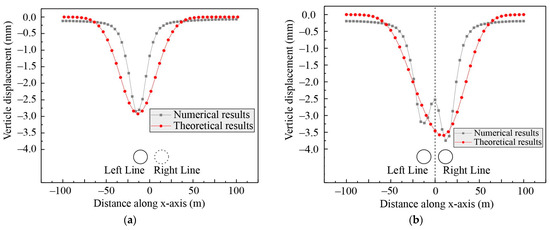 Comparison between the numerical and theoretical results of ground surface deformation: (a) single-line shield tunnel excavation (S4); (b) double-line shield tunnel excavation (S8).