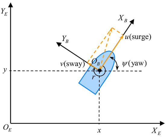 The schematic diagram of USV planar motion is shown in Figure 1. The USV has a symmetrical structure, which simplifies the complexity of the mathematical model. The inertia reference frame is fixed on the ground, and the origin point of the body reference frame coincides with the center of USV. Based on the Newton–Euler method, the dynamic model of USV is described as shown below: