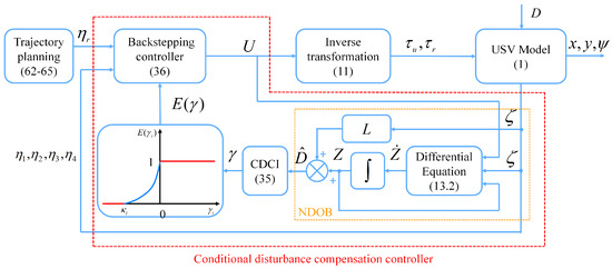 In this section, we propose a conditional disturbance compensation control (CDCC) scheme for the trajectory tracking of USV under the lumped disturbance. The control scheme block diagram is shown in Figure 2.
