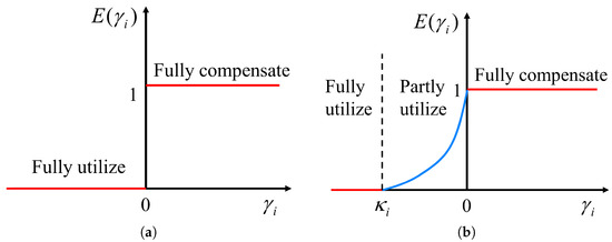 The traditional disturbance characterization index (DCI) in [21,23] is designed as , as shown in Figure 3a. If , , it indicates that the disturbance is harmful. Then, the controller fully compensates for the disturbance. Contrarily, if , , it indicates that disturbance is beneficial. Then, the controller fully utilizes disturbance. However, it should be noted that the traditional DCI introduces the function , which makes only take discrete values and can only take discrete values . Under normal working conditions, the error vector is generally near zero; namely, the actual working point of the controller is generally near the longitudinal axis. Thus, the value of and may change frequently, which may cause the chattering phenomenon.