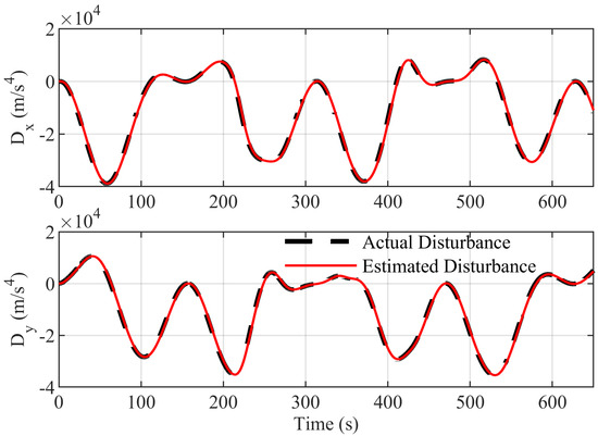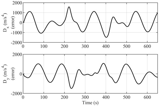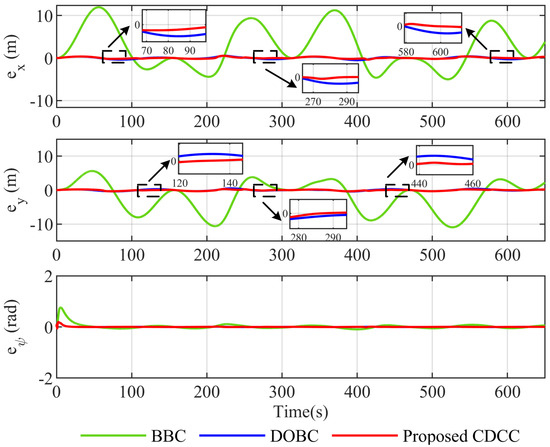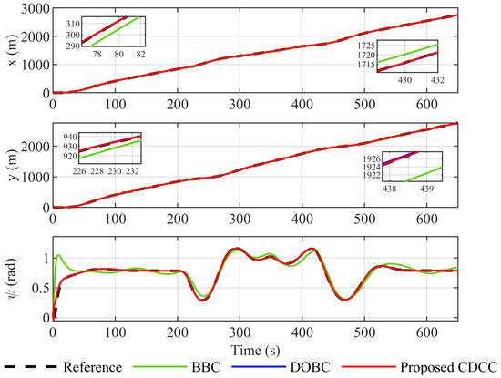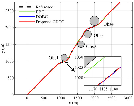 Figure 5 shows the trajectory tracking response of three control methods in the obstacle scenario. The black dashed line is the reference trajectory generated by the trajectory-planning method designed in Section 4. It guides the USV system to avoid obstacles (gray circles). Then, we select the basic backstepping control (BBC) method and the disturbance observer-based control (DOBC) method as the comparison objects of the proposed CDCC method. The BBC method does not compensate for the lumped disturbance. The DOBC fully compensates for the lumped disturbance. From Figure 6 and Figure 7, the BBC method has a large tracking error. Conversely, the DOBC method and the proposed CDCC method can compensate for the lumped disturbance based on the estimated value of the NDOB, making the USV track the reference trajectory accurately. Figure 8 depicts the lumped disturbance estimation of the NDOB. We can see that the NDOB can estimate the lumped disturbance in a timely manner. According to Figure 9, the estimation error is not more than relative to the actual disturbance, so the designed observer has an excellent estimation ability.