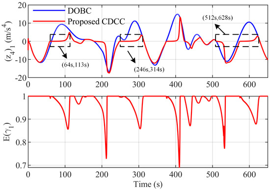 However, the proposed CDCC method is superior to the DOBC method. As shown in Figure 7, the proposed control method has a smaller overshoot and faster tracking than the DOBC method, because the proposed CDCC method introduces in the control law (36), which can dynamically adjust disturbance compensation. During the periods (64 s, 113 s), (246 s, 314 s), and (512 s, 628 s) in Figure 10, according to (35) and (37), and are satisfied. This indicates that the disturbance is beneficial for system stability. In these periods, the proposed CDCC method utilizes the disturbance rather than fully compensating for it as done by DOBC, accelerating the error convergence. Similarly, during the periods (103 s, 157 s), (284 s, 315 s), and (408 s, 470 s) in Figure 11, also indicates that the disturbance is beneficial. The proposed CDCC can utilize it to accelerate the error convergence.