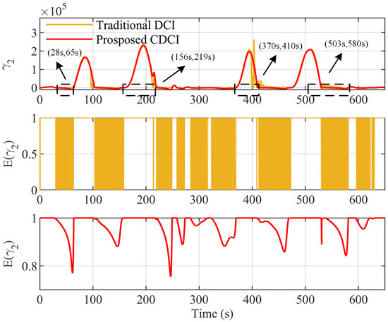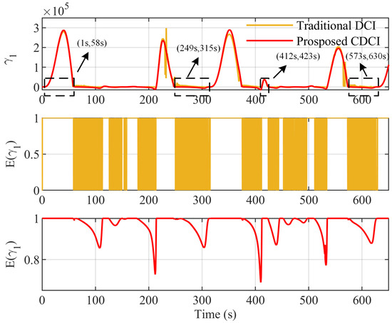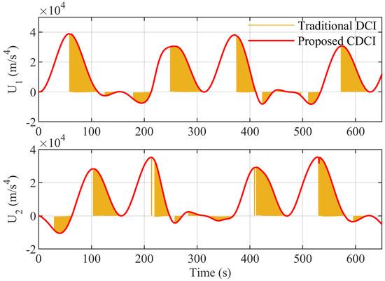 As shown in Figure 12, the disturbance is regarded as harmful when , such as the periods (1 s, 58 s) and (412 s, 423 s). During these periods, holds in both the traditional DCI and the proposed CDCI, which instructs the controller to eliminate disturbance. However, as shown in Figure 3a, the function of a traditional DCI changes abruptly between 0 and 1. It will cause discontinuous control law switching and control signals chattering. This drawback is clearly demonstrated in Figure 12. For example, during the periods (249 s, 315 s) and (573 s, 630 s), the value of is around zero, which causes the value of of a traditional DCI to frequently jump between 0 and 1. The controller switches infrequently between full compensation and full utilization. Thus, the traditional DCI causes the chattering phenomenon of the control signal. In contrast, of the proposed CDCI is a continuous function. This ensures the value of in the proposed CDCI continuously changes between 0 and 1 rather than experiencing abrupt changes. The controller switches smoothly between full compensation, partial utilization, and full utilization, as shown in Figure 3b. Thus, the proposed CDCI can suppress the chattering phenomenon. Similarly, for the periods (156 s, 219 s) and (370 s, 410 s) in Figure 13, indicates the disturbance is harmful. Both the traditional DCI and the proposed CDCI instruct the controller to eliminate harmful disturbances. For periods (28 s, 65 s) and (503 s, 580 s), the of the proposed CDCI is also continuous. Therefore, the proposed CDCI can make the control law switch continuously and suppress the chattering phenomenon.