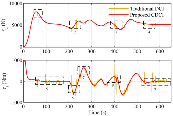 Furthermore, Figure 14 and Figure 15 more intuitively verify that the proposed CDCI can effectively suppress the chattering phenomenon of control inputs. Figure 14 presents the virtual control law response curves of the fully actuated system. It can be seen that the virtual control inputs have a smoother response under the instruction of the proposed CDCI. According to the dashed box (1–9) in Figure 15, the control inputs () and () under the traditional DCI have obvious peaks and chattering phenomenon. In contrast, the peaks and chattering phenomenon under the proposed CDCI is significantly suppressed.