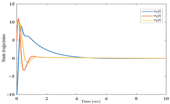 For the given , the state responses and the control input of the T-S fuzzy system are illustrated in Figure 1 and Figure 2, respectively. Figure 1 demonstrates the stability of the permanent magnet synchronous motor model, validating the effectiveness of the designed controller and the proposed methods.