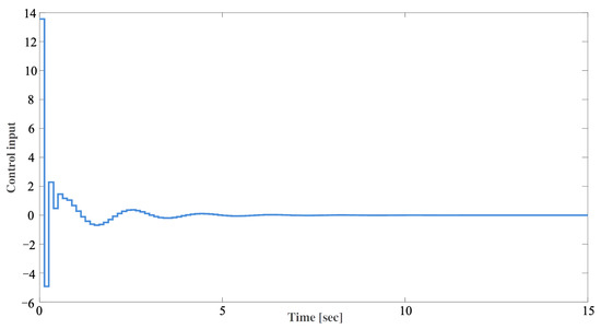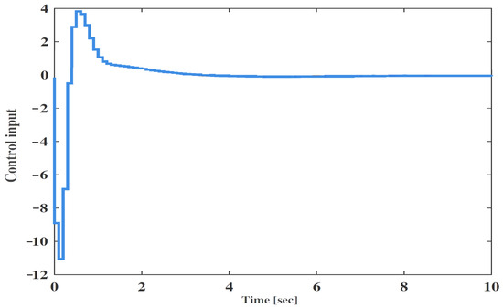For the given , the state responses and the control input of the T-S fuzzy system are given in Figure 3 and Figure 4, respectively. As shown in Figure 3, the system is achieving stability, which affirms the effectiveness of the presented controller and methodology.
