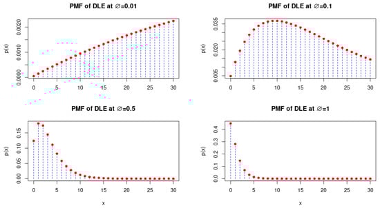 Figure 1 shows that the PMF of the DLE distribution can be right skewed depending on the selected values of the parameters. The mode of the DLE distribution moves towards the left for large values of .