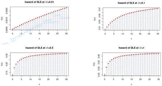 Figure 2 illustrates that the behavior of the HRF of the DLE distribution is increasing for different values of .