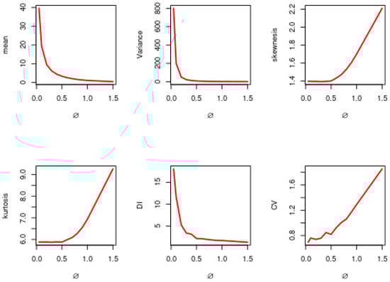 From Table 1 and Figure 3, it is concluded that as increases, the mean and variance are decreased, while the skewness and kurtosis are increased. In addition, it is clear that the DLE distribution is suitable for modeling over-dispersed data sets since the DI is greater than one. The DLE distribution is also positively skewed with various shapes of kurtosis.