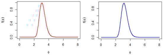 where LL and UL are the lower and upper limits of the 100 (1 − ) % credible interval for , respectively, and is the posterior distribution of given the sample . Since Equations (37) and (39) are not similar to any well-known distributions, we use plots of these posterior distributions to show that the distributions in Equations (37) and (39) behave similarly to the normal distribution, see Figure 4. Thus, we employ the Metropolis-Hastings technique with normal proposal distributions, as follows: