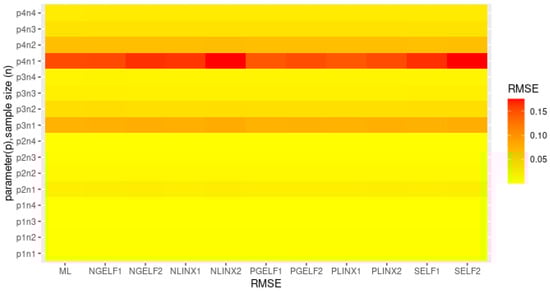 Heat-map for RMSE based on ML estimation and Bayesian estimations at different values for parameter and different sample sizes , .