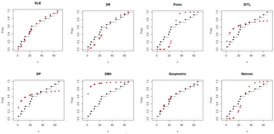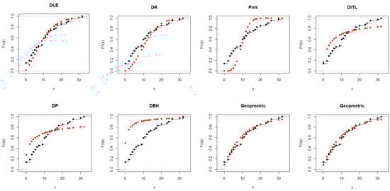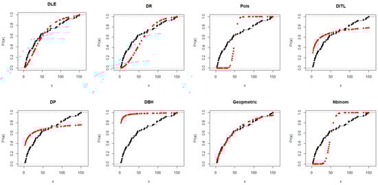 Plots of fitted CDFs (red) versus empirical CDFs (black) for Dataset II.