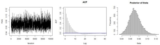 The Bayesian estimator of for different loss functions cannot be achieved in closed forms, as is evident from Equations (40)–(45). This can be found numerically using Bayes MCMC techniques to generate samples from the posterior distribution and then obtain the Bayesian estimators of along with three different loss functions.