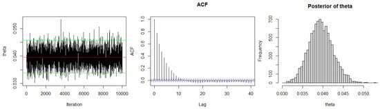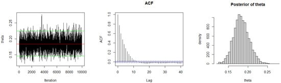 Figure 9, Figure 10 and Figure 11 display the trace, ACF, and density function DLE parameter values to check the convergence of the MCMC method after burn-in. These results imply that the chains converge well and that the burn-in period is appropriate.