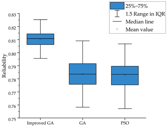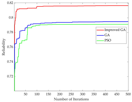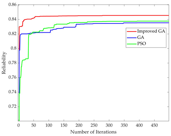 The reliability data of the components after maintenance, using the three algorithms, are shown in Table 4 and Table 5. It is evident that the improved GA proposed in this paper not only achieves superior final reliability improvement results but also benefits from the incorporation of the importance measure. This allows the improved GA to focus on critical aspects of maintenance tasks while seeking the optimal solution. As a result, the convergence speed of the improved GA is significantly better than that of both the traditional GA and the PSO algorithm.