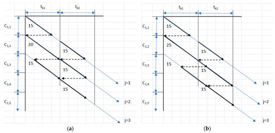 For the numerical example, we assume that the assembly line consists of two stations, m = 2, and three products are assembled, n = 3 (Figure 1). The cycle time of assembly stations, Ci,j, is 15 min, and takt time of the assembly line is 20 min. The second operation of the second product j = 2 was disrupted and cycle time C1,2 was equal to 25 min (Figure 1b). The question is, what are solution robustness and quality robustness indicators? First, the effect of the disturbance on each machine cycle is measured using MCdelayi,j for each product. Next, the effect of the disturbance on takt time is measured using TTdelayi,j: