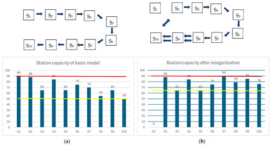 Figure 2. Balanced assembly line flow with capacity of stations (red line—takt time, yellow line—minimum cycle time) (a) with low-skilled workers dedicated to the stations and (b) with highly qualified workers dedicated to the stations 8, 9 and 10.