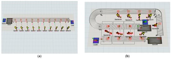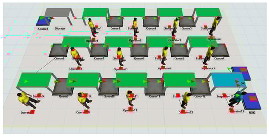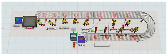 The best fit was obtained for the lognormal distribution. The distribution parameters were then used in FlexSim to model the assembly process taking into account human errors. The developed S-shaped assembly line model is shown in Figure 10.