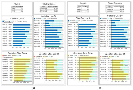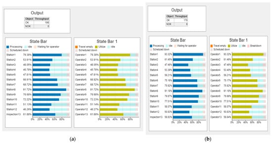 Figure 11. Comparison of simulation results of the assembly process during one shift of 8 h: (a) model with deterministic parameters and (b) model with stochastic parameters.