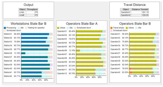 In the second version of the model, stochastic process parameters were used, including the variability of assembly times according to the lognormal distribution (location = 119.1, scale = 7.18, shape = 1.1), operator errors MTBFh = 8 h and MTTR = 5 min, and the quality distribution of 95% of good products (for low skill operators). The obtained simulation results are presented in Figure 11.