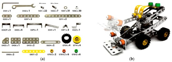 Figure 8. Assembly process of a model car: (a) assembly kit and (b) finished car.