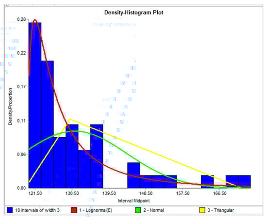 Figure 9. Fitting statistical distribution to the data. 1—Lognormal, 2—normal, and 3—triangular distribution.