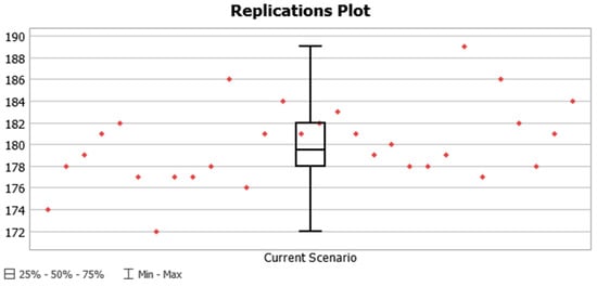 The model with random parameters is characterized by a significant scatter of results. The replication plot for the production of good quality products in a series of 30 replications is presented in Figure 12. The statistical summary of the obtained results is presented in Table 7.