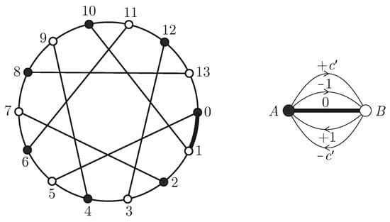 Left: The Heawood graph with a diameter 3, which is isomorphic to the chordal ring . The vertices are numbered. Right: The base graph of a chordal ring graph on the group , with vertices A and B, where . Every edge has its voltage. (The black and white vertices stand for the even and odd vertices, respectively.) The thick lines represent the edges with voltage 0 in the base graph and in the first copy of the lift graph.
