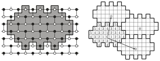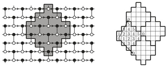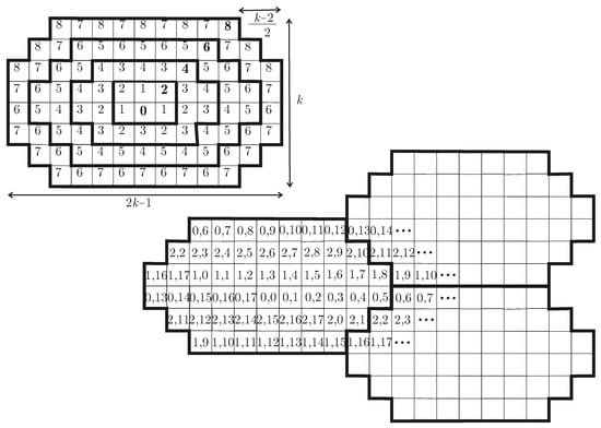 For every even k, an optimal tile with an area periodically tessellates the plane and corresponds to a chordal m-ring graph with . See Figure 7 (up) for , where the distances from vertex 0 are indicated. Then, from the distribution of the 0s, it can be checked that the corresponding graph has chord . See Figure 7 (down) for with the vertices labeled like in Definition 4. The obtained chordal 3-ring graph is shown in Figure 6 (middle). □