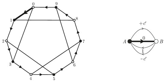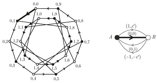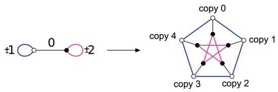 An (ordinary ) voltage assignment on the (di)graph is a mapping with the property that for every arc . Thus, a voltage assigns an element to each arc of the graph so that a pair of mutually reverse arcs a and , forming an undirected edge, receive mutually inverse elements g and . The graph and the voltage assignment determine a new graph , called the lift of , which is defined as follows. The vertex set of the lift is the Cartesian product . Moreover, for every arc from a vertex u to a vertex v for (possibly, ) in , and, for every , there is an arc from the vertex to the vertex . Let us show the example illustrated in Figure 4. In this example, when the base graph with a voltage assignment on the arcs (drawn on the left) is applied to the group , we obtain the Petersen graph (drawn on the right). Since the group is , we have five copies (numbered from 0 to 4) of the vertices of the base graph. So, as the voltage of the pink edge is 2, we have to join the black vertices by adding to each copy. We do the same for the other edges, each with its corresponding voltage.