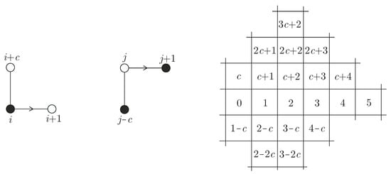 As commented in the introduction, chordal ring graphs can be represented as congruent tiles that tessellate the plane periodically. More precisely, if each vertex of is represented by a numbered unit square, the vertices reached at a distance from any given vertex can be arranged in a planar pattern, as shown in Figure 5, starting from vertex 0.
