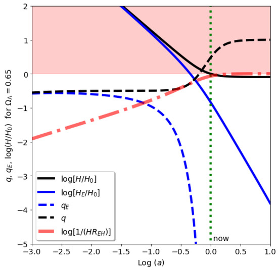 Log of cosmic expansion rate (continuous lines) and acceleration (dashed lines) as a function of time (log scale factor a) for . The black lines correspond to the usual interpretation in terms of 3D spatial coordinates: H and q. The blue lines show the corresponding results for the measurement in terms of 4D events: and . Without , both are equivalent. Gravity decelerates the expansion until it asymptotically brings it to a halt (, with an EH: ). The effect of according to the coordinate interpretation is to accelerate the expansion. While according to the proper distance R, it decelerates the expansion even further and brings it to an early halt: and at a finite horizon . This additional deceleration is caused by the friction term: in Equations (15) and (16) (dashed-dotted red line).