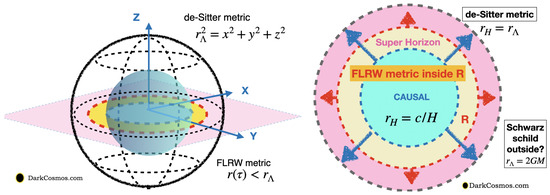The FLRW metric with asymptotically tends to the de Sitter metric in Equation (6). This form corresponds to a static 4D hypersphere of radius . So in this (rest) frame, events can only travel a finite distance within a static 3D surface of the imaginary 4D hypersphere. The region inside is causally disconnected from the outside. In the context of the FLRW framework, this condition corresponds to , where is a radial (space-like) distance. This condition implies that the expansion interpretation is valid only as long as , indicating that it does not make sense for larger values where we cannot transition from to . Essentially, beyond this threshold, the cosmological interpretation of expansion breaks down due to the causal disconnection imposed by the horizon defined at .