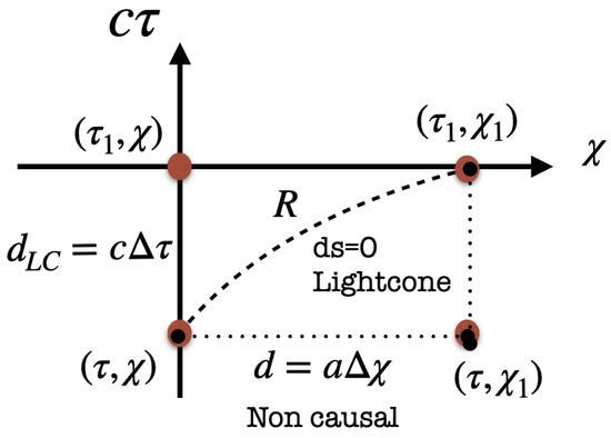 Consider the distance between two events corresponding to the light emission of a galaxy at and the reception somewhere in its future . The photon travels following an outgoing radial null geodesic , which, from Equation (3), implies . This situation is depicted in Figure 3. We can define a 3D space-like distance d based in the comoving separation :