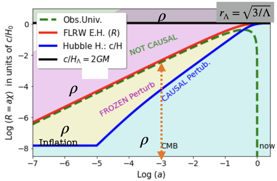 Proper coordinate in units of as a function of cosmic time a (scale factor). The Hubble horizon (blue continuous line) is compared to the future event horizon (red line) as defined in Equation (17). Larger radii (magenta shading) represent causally disconnected regions, while smaller ones (yellow shading), created during cosmic inflation, remain dynamically frozen. The full observable universe (dashed green line) encompasses both causal (blue shading) and frozen regions. Note how the observable region is bounded by : we can not measure any inhomogeneities or anisotropies even if the density is discontinuous at R. Compare to Figure 2, which depicts a view at a fixed a using the same color coding. After inflation, begins growing again, and by (present epoch), both and approach (in black). The vertical dash orange arrows indicate the CMB epoch.