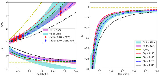 where . The authors of [20] find a good fit using and for the full SNIa “Pantheon Sample”. We use these values of A and B and their corresponding errors to estimate H, q, and using the above relations. The results for H and q are shown as shaded cyan regions in the left panel of Figure 5. They are compared to the LCDM predictions (dashed lines) in Equations (4) and (5).