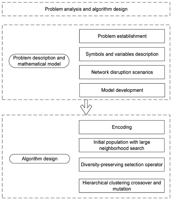 The flowchart visually represents the structured approach taken to solve the problem of urban rail transit network planning. It begins with the problem establishment, where key challenges and objectives are identified. Next, a two-stage mathematical model is developed to minimize costs and operating time while ensuring network symmetry. Following model development, the focus shifts to algorithm design. Here, a hybrid evolutionary algorithm is crafted to solve the proposed model effectively. The algorithm incorporates various enhancement strategies, including Large Neighborhood Search for initial population generation, diversity preservation mechanisms, and hierarchical clustering-based cross-over and mutation operations.
