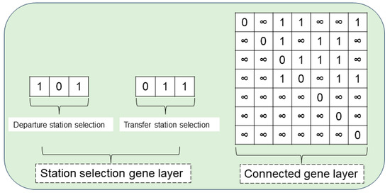 The gene length of the location gene layer equals the total number of candidate departure and transfer points, using 0–1 encoding to express the selection of departure and transfer points in segments. Meanwhile, the connectivity gene layer, based on the location gene layer, expresses the connectivity between nodes in the form of an adjacency matrix. Its gene length corresponds to the adjacency matrix formed by selected departure, transfer, and destination points, with a value of 0 on the main diagonal, 1 for connectivity between different nodes, and ∞ for non-connectivity.