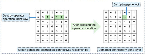 In the destruction operator operation, we first randomly select the node number to be destroyed, which is generated from the selected departure points and transfer points. For the selected destruction node number, starting from the index row of the corresponding node in the connectivity gene layer, a portion of the current connectivity is randomly interrupted, forming the destroyed connectivity gene layer. The repair operator operation then restores the destroyed connectivity gene layer. Starting from the index row of the destruction node number, we search for nodes that are currently unconnected but can be connected to the node, randomly establishing a connection between the destroyed node and the unconnected node, thereby producing the repaired connectivity gene layer. Subsequently, the legality of the repaired connectivity gene layer is checked through constraint conditions to generate a neighborhood solution set. Taking the connectivity gene layer in Figure 2 as an example, assuming a one-gene destruction and repair operation, the specific operations are illustrated in Figure 3 and Figure 4.