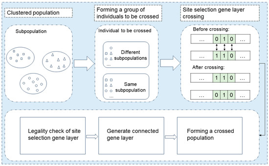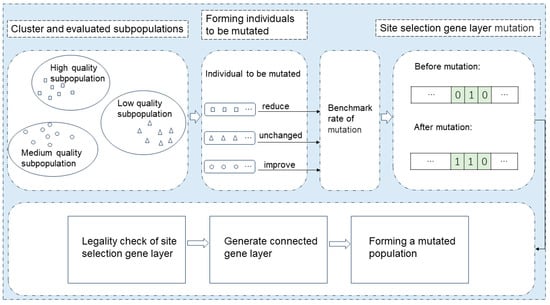 In generating the initial population, we combine Equation (9) to randomly generate a location gene layer that satisfies constraints. Based on the site selection situation in the location gene layer, comprising departure points and transfer points, Equations (10)–(14) are utilized to randomly determine the selected departure points, transfer points, and connectivity between demand nodes, thereby generating the connectivity gene layer. However, there are numerous legitimate connectivity schemes that meet Equations (10)–(14). If only random generation is employed to produce the initial population, it is challenging to obtain a high-quality initial population. Moreover, due to the high randomness of the connectivity gene layer, the algorithm’s optimization process may become unstable.